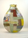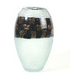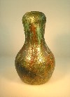 Kalebassenform mit bauchiger Wandung und enger eingezogener Mündung. Opalglas hat marmorierte, im oberen Teil vertikal gestreifte Glasaufschmelzungen, die der Vase ein Keramik ähnliches Aussehen geben. Diese Vase war im von Zezschwitz Auktionskatalog von 2003 abgebildet, Objekt 181. Als Vergleichsstück habe ich eine ähnlich gearbeitete Cenedese Vase aus ebengleichem Katalog abgebildet.