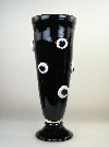 Vase von Carlo Moretti aus weißem Glas, schwarz überfangen und partiellem Klarglasüberfang. Auf der Wandung 8 weiße Scheibenapplikationen mit schwarzen Punkten. Die Vase steht auf einem schwarzem Standfuß, der unterseitig mit Carlo Moretti in Ritzsignatur