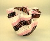 Typischer Faltenwurf, diagonal umlaufend aufgeschmolzene Bänder in weiß, rosa und dunkelviolett, dazwischen immer wieder Klarglas. Geplanter Stand, der einen keinen ausgekugelten Abriss hat.