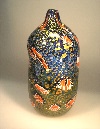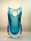 Türkisfarbener Kern, mit Uranglasüberfang, und türkisfarbener Überfang, darüber ein wasserblauer Überfang und ein Klarglasüberfang, also 5 Schichten Glas. Ovoide organische Form mit hochgezogenen Seitenteile und mit 2 Durchstichen im oberen Viertel. Die Vase ist bezeichnet mit Datum: 25.6.83 und Unterschrift: L.Onesto und 18/25 für die limitierte Auflage.
