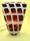 Klares Glas mit einem Incalmo Streifen aus Kupfer Aventurin, dieses im Schachbrettmuster, das klare Glas ist mit Battuto Dekor verziert.