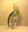 Figurine Klarglas mit grünen und blauen Glaseinschmelzungen und reichlicher Goldpuder-Einstreuung, Signatur am Stand und goldenes Muranolabel vorhanden.