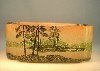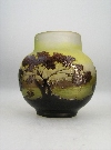 2 seitig abgeflachte Kugelform, gelbes Glas, hell und dunkelbrauer Überfang im Landschafts Dekor, hochgeätzte Signatur.