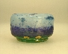 2 seitig abgeflachte Kugelform, gezwickte Mündung, gelbes Glas, im unteren Bereich ins blaue gezogen, Dunkelvioletter Überfang im Schilf Dekor.