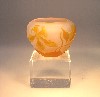 2 seitig abgeflachte Kugelform, rosafarbenes Glas mit orangefarbenen Pulvereinschmelzungen, auberginefarbener Überfang mit floralem Frauenschuh-Dekor, hochgeätzte Signatur.