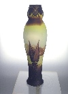 Vase mit langgezogenem Korpus, gelbes und opal-weißes Pâte de verre Glas, auberginefarbener Überfang mit Landschaftsdekor, hochgeätzte Signatur.