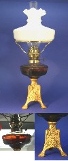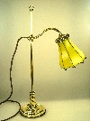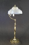 Opalisierender Glasschirm, Fuß aus kannelierter Hohlschaftröhre ( diese aus zwei Längsstücken zusammengelötet ) und handgetriebenen Stand, alter Porzellandrehschalter.