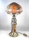 Typischer Kinderreigen von Michael Powolny, Fuss aus ebonisiertem Eichenholz, der Reigen aus Zinn, die Glaskuppel hat Martelé Dekor. das Zwischenstück ist so gearbeitet das Luft ins Innere der Lampe drinnen kann. das Zwischenstück und der Knauf sind aus Messing.
