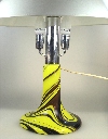 Gelbes Glas mit dunkelbraunen Glaseinschmelzungen, verchromte Montur mit 3 Lampenfassungen, Label vorhanden