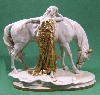 Eine langhaarige Jugendstil Schönheit lehnt in träumerischer Pose an ihrem grasenden Pferd. Die Frau hat ein im Wind flatterndes mit Goldbemalung verziertes Kleid, ebenso ist das Zaumzeug, die Krone des Pferdes und der Sockel mit Goldfarbe belegt. Unter dem Stand die Signatur von Scheibe-Alsbach.