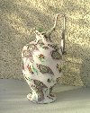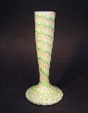 Opak weißes Glas. In die farblose Deckschicht eingeschmolzene, federblattartig gekämmte Fäden in Rosa und Grün. Oberfläche säuremattiert.